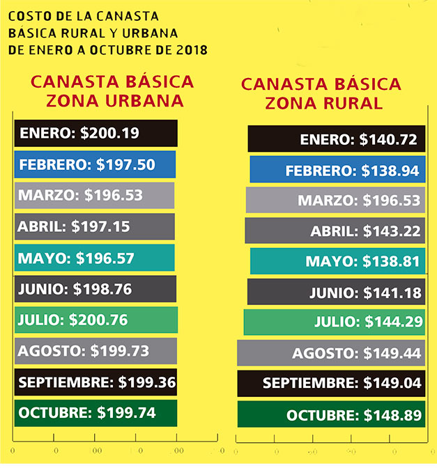 Durante los primeros diez meses de 2018, el precio de la canasta básica rural se ha incrementado en diferentes momento, pasando de costar $140.72 en enero hasta reportar un valor de $149.44 en agosto, el más alto durante todo el año y que coincide con el cierre de la sequía.