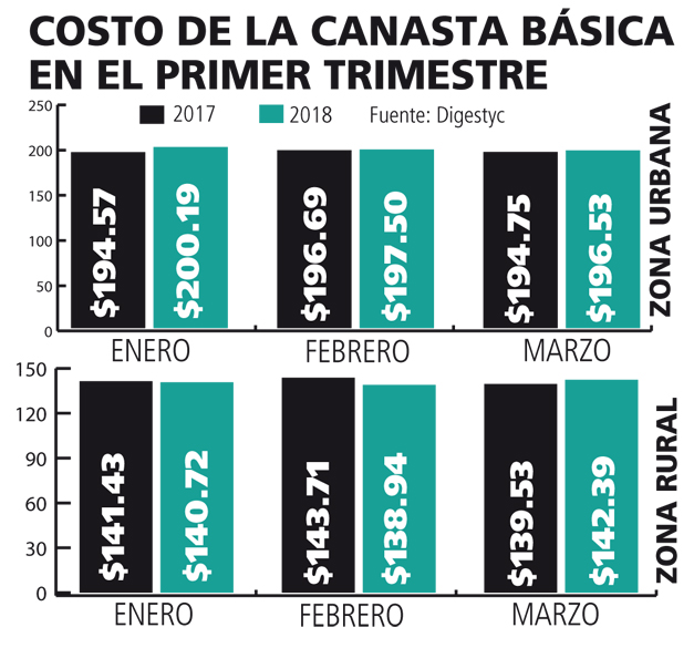 La Digestyc, dependencia del Ministerio de Economía (Minec), muestra que el costo de la CBA urbana llegó a $196.53 enmarzo pasado. Si bien esto implicó un aumento de $1.78 (0.91%) respecto a marzo del año pasado -cuando costó $194.75-, es menor a los $200.39 de diciembre y los $200.19 de enero. En febrero, el costo se ubicó en $197.50.