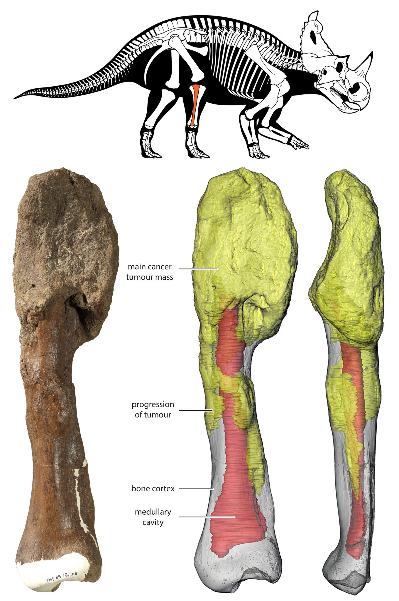 El descubrimienro se hizo a partir del diagnóstico a una pierna malformada de un Centrosaurio, inicialmente se pensada que era una fractura en curación pero los científicos descubrieron que se trataba de “osteosarcoma”, un cáncer maligno y agresivo que provoca el crecimiento excesivo de un hueso y que se propaga rápidamente por todo el organismo, especialmente en los pulmones. Es recurrente en humanos entre la segunda o tercera década de la vida.