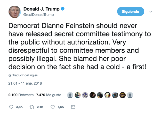El presidente estadounidense no negó la controversial frase y señaló que la demócrata Dianne Feinstein nunca debió haber "revelado" al público el testimonio "sin autorización". Lo tildó de irrespetuoso y posiblemente ilegal.