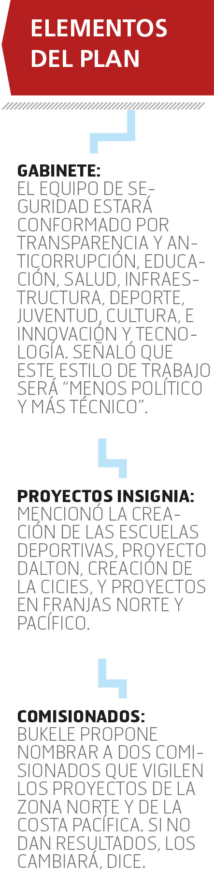Dijo que el Gobierno será digitalizado y utilizará herramientas tecnológicas. “Esto es lo que tendrá el Presidente en su pantalla. No en una, en 10 pantallas”, expresó, mostrando un mapa de El Salvador y agregando que así el gobernante sabrá, por ejemplo, cómo están las calles de Morazán. “Queremos pasar de esos gabinetes arcaicos a un gabinete en donde el centro están ustedes”, expresó, ante aplausos de sus seguidores.
