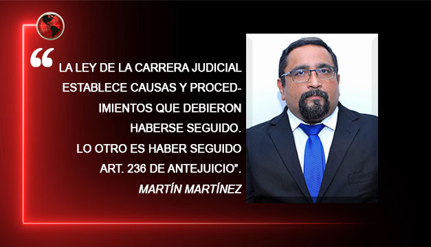 Para el candidato, el procedimiento utilizado fue ilegal, ya que el artículo 186 de la Constitución establece que la destitución se puede hacer por “causas específicas, previamente establecidas por la ley”. En ese sentido, considera que podría remitirse a la Ley de la Carrera Judicial. “Establece causas y procedimientos que debieron haberse seguido”, dijo Martínez.