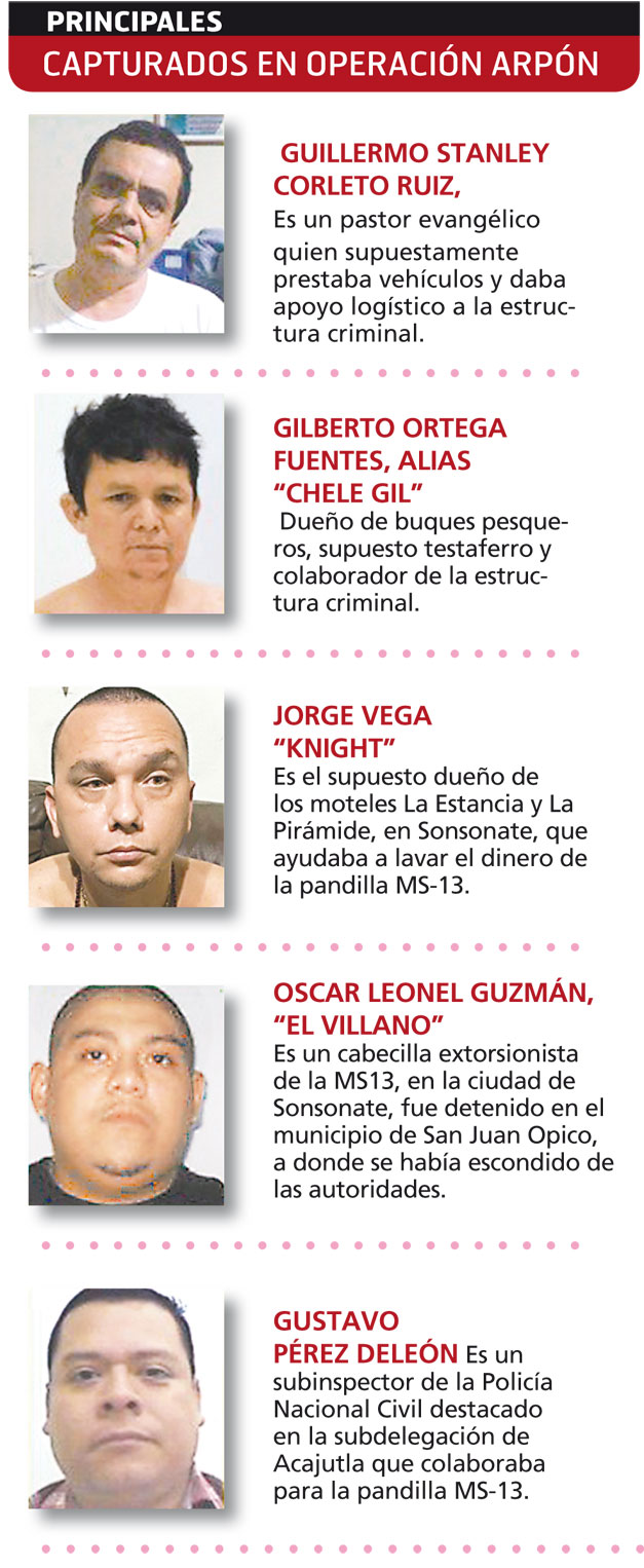 Entre los detenidos, están ocho supuestos testaferros de la MS-13 que cometieron lavado de dinero, entre ellos Gilberto Ortega Fuentes, alias “Chele Gil”, quien supuestamente es dueño de buques pesqueros y tenía negocios con el cabecilla de la referida estructura criminal Gerardo Antonio Avelar, alias “Skini”, de Usulután.