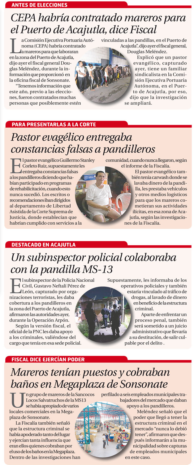 El fiscal general, Douglas Meléndez, destacó que también fue capturado el empleado administrativo de los juzgados de Sonsonate, Norberto Cortez Pérez, que se dedicaba a informar a “El Villano”, sobre las actuaciones de la Fiscalía y la policía. También fue detenido el sub inspector Gustavo Neftalí Pérez de León, destacado en la subdelegación policial de Acajutla, Sonsonate, por el delito de agrupaciones terroristas.