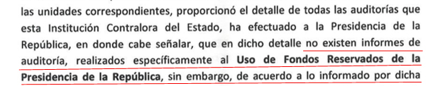 La Coordinación General Jurisdiccional de la Corte de Cuentas, como receptora de informes de auditoría y encargada de distribuirlos a las unidades correspondientes, entregó al DAIP el detalle de todas las auditorías que la Corte de Cuentas ha realizado a la Presidencia de la República. “En dicho detalle no existen informes de auditoría realizados específicamente al uso de fondos reservados de la Presidencia de la República”, reza la respuesta de la institución.