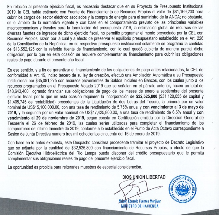 De acuerdo al documento, la CEL amplió su presupuesto en $35,091,275 de saldos en bancos llegando a tener un presupuesto de $48,643,400 para financiar sus obligaciones de enero a septiembre de 2019. Por ello, piden a la Asamblea Legislativa que incorpore de $32,525,800 provenientes de dos Letras del Tesoro que vencen el 3 de mayo de 2019 (por $31.1 millones con $1.4 millones de rentabilidad) y el 29 de noviembre de 2019 (por $17.4 millones). Estas Letras del Tesoro “serán utilizadas para completar el financiamiento de los compromisos del último trimestre de 2019”, indica Hacienda.