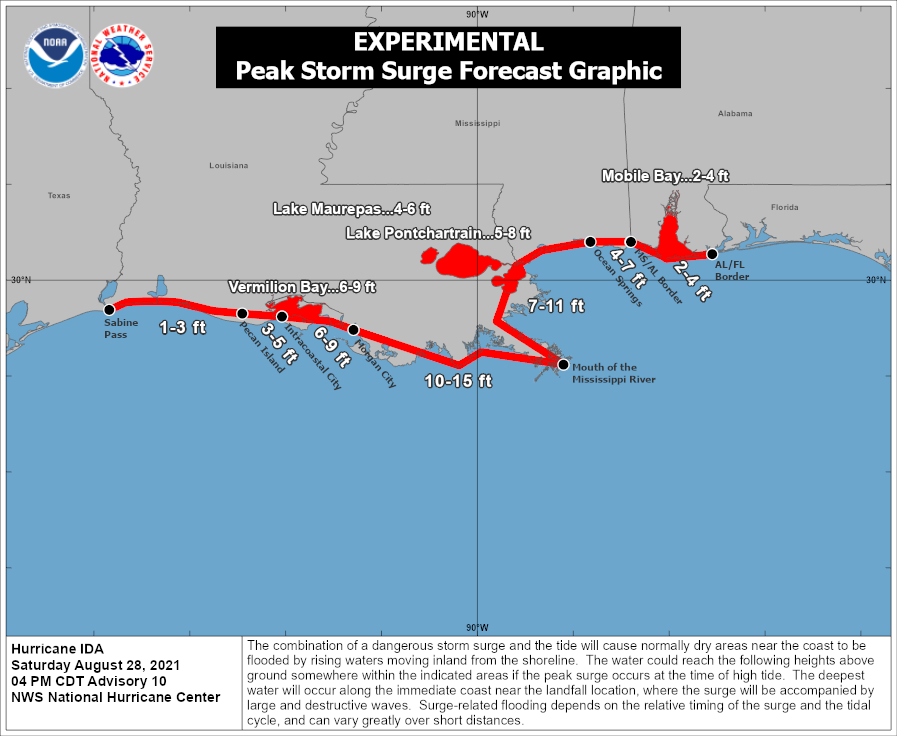 Se espera que Ida toque tierra a lo largo de la costa de Luisiana dentro del área de advertencia de huracán el domingo, y luego se mueva tierra adentro sobre partes de Luisiana y el oeste de Misisipi más tarde el lunes”. Centro Nacional de Huracanes.
