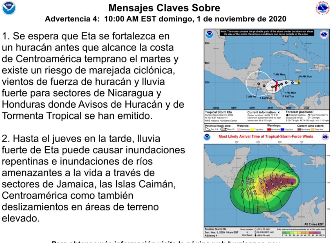 El Centro Nacional de Huracanes (NHC) de EEUU emitió este domingo una advertencia para Centroamérica sobre el avance de la tormenta tropical "Eta" que se fortalece a gran velocidad en el Caribe y que tocará las costas de Nicaragua convertido en huracán categoría 1.