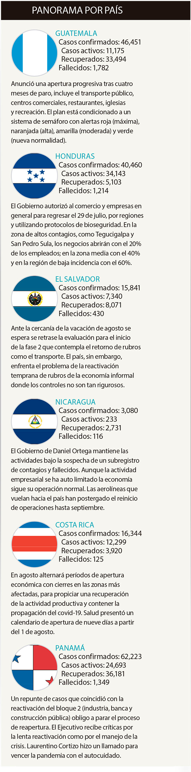 La región centroamericana ampliará en agosto sus planes de reactivación económica, pese a que los índices de nuevos contagios de covid-19 siguen altos.