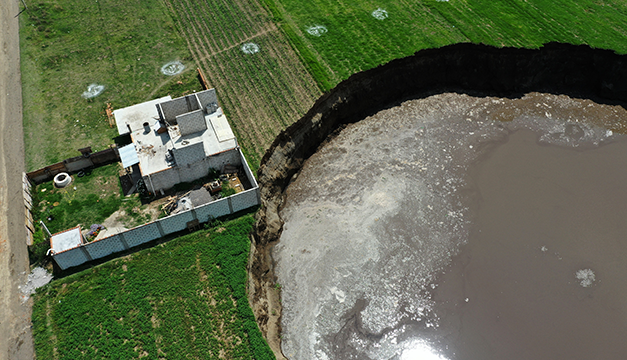 El agujero tenía unos 30 metros de diámetro, el lunes se amplió a 60 y las autoridades calculaban que había alcanzado 80 metros. El hundimiento está a punto de llegar a la vivienda de la familia Sánchez, que habita en la zona desde 2014.