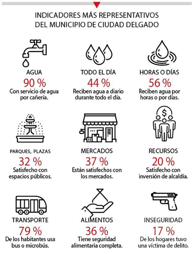 La gestión de la actual alcaldía de Ciudad Delgado es evaluada como buena o muy buena por el 19 %; un 52 % la evalúa como “regular” y un 22 % como “mala o muy mala”.