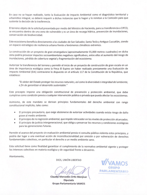 “Quiero llamar la atención de la Comisión en el sentido que la Finca El Espino es un área natural del área metropolitana de San Salvador que da servicios ambientales muy importantes a los capitalinos, tecleños y a la población de Antiguo Cuscatlán. El Espino ha sufrido destrucción durante décadas en el marco de los gobiernos anteriores, empezaron a acabarse El Espino”, expresó la diputada de Vamos.