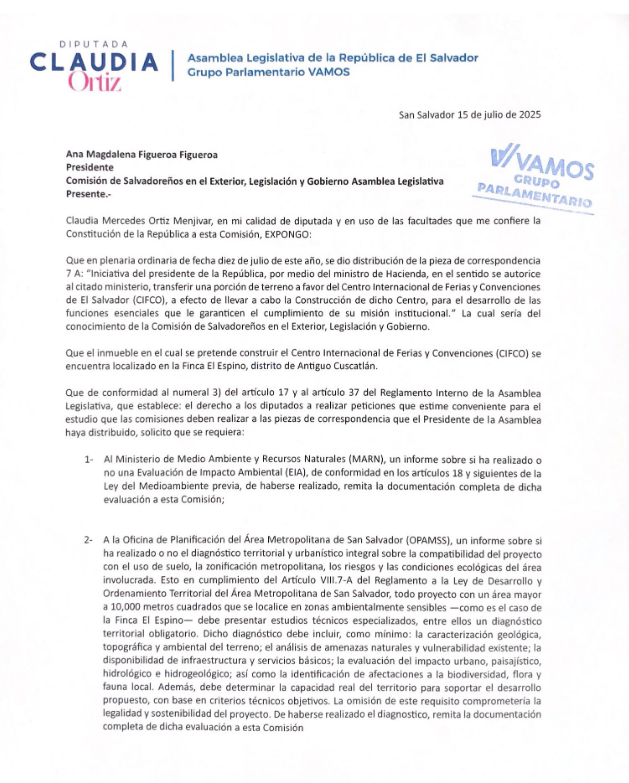 La diputada Claudia Ortiz, de Vamos, solicitó el martes a los diputados de la Comisión de Salvadoreños en el Exterior que soliciten al Ministerio de Medio Ambiente y Recursos Naturales (MARN) que les remita o realice el estudio del impacto ambiental de la construcción del Centro Internacional de Ferias y Convenciones (CIFCO) en una porción de terreno de 55,711 metros cuadrados ubicado en la Finca El Espino.