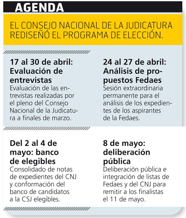 El CNJ ha diseñado su calendario del proceso de elección en cinco fechas: la evaluación de las entrevistas, el análisis de los 15 candidatos propuestos por los abogados que votaron en la elección organizada por la Federación de Asociaciones de Abogados de El Salvador (Fedaes), la realización de un banco de elegibles, la deliberación y el envío del listado definitivo a la Asamblea Legislativa.