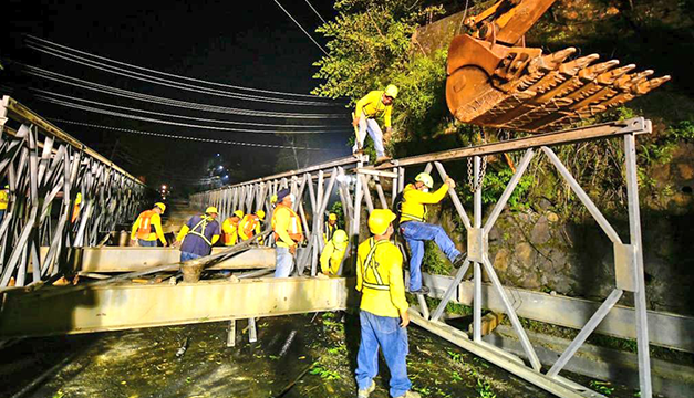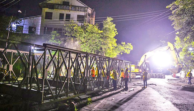 La madrugada de este domingo comenzó el ensamblaje de un puente provisional que es instalado en un tramo de la calle Agua Caliente, que conecta a los populosos municipios de Soyapango y Ciudad Delgado.