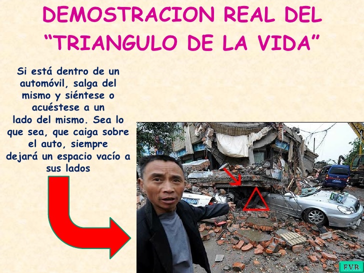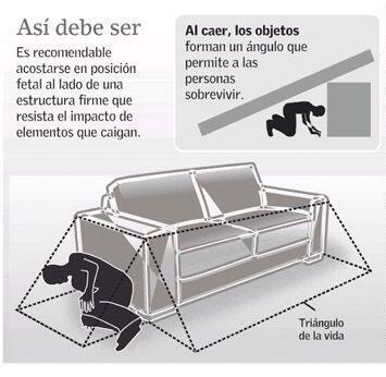 Cuando las construciones colapsan, el peso del techo cae sobre los muebles y los aplasta, pero deja un espacio junto a éstos; a este pequeño espacio se le llama "triángulo de vida", y aquí es donde puedes salvar tu vida.