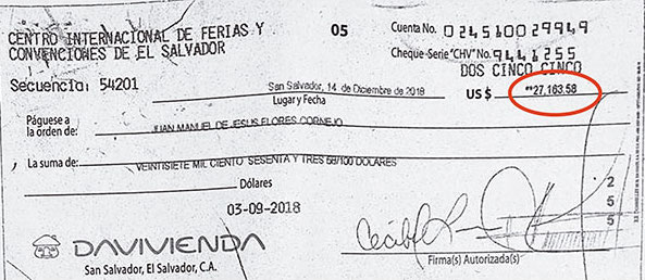 Según el diputado del FMLN, él firmó un contrato de arrendamiento con el Cifco como representante del CCPIT para arrendar el Pabellón Centroamericano y el pabellón internacional número 11, incluyendo una cláusula sobre un depósito en caso de daños. El Cifco recibió $55,000, cobró $27,836.42 por el arrendamiento y regresó el resto en un cheque a nombre de Juan Manuel de Jesús Flores Cornejo.