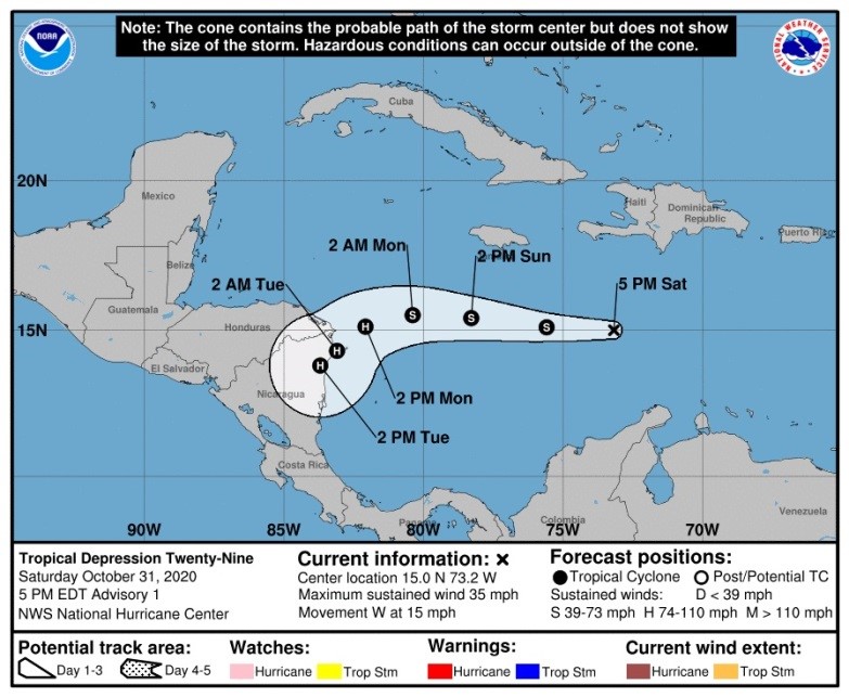 Se caracteriza porque sus vientos máximos constantes alcanzas una velocidad menor o igual a 62 kilómetros por hora o inferior, según el Ministerio de Medio Ambiente y Recursos Naturales.- Por ejemplo, primero Eta fue la depresión tropical veintinueve y se formó el sábado 31 de octubre frente a las costas de la isla caribeña de Jamaica a 510 kilómetros al suroeste de su capital, Kingston, presentaba vientos de 55 kilómetros por hora y se movía a una velocidad de 24 kilómetros por hora.
