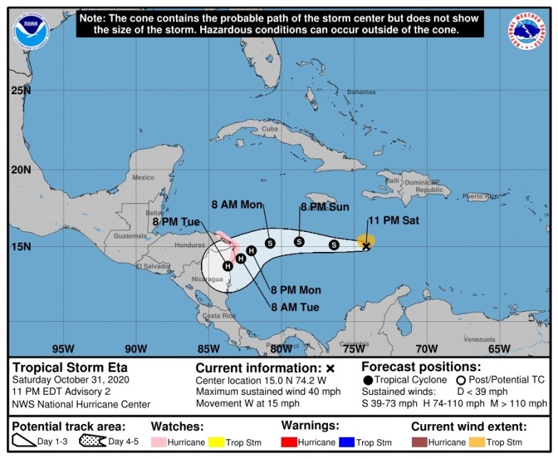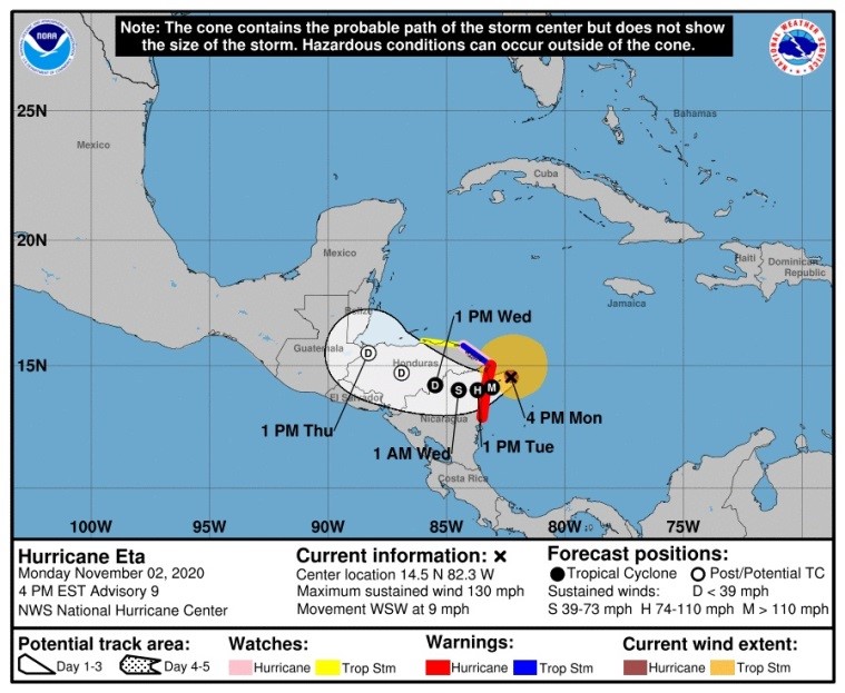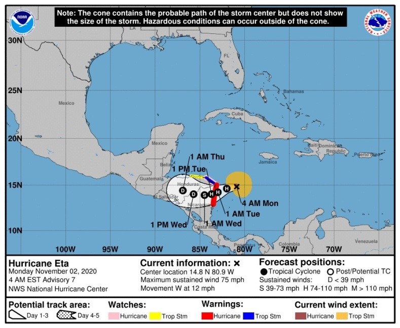 - La mañana del lunes 2 de noviembre, Eta pasó a ser un huracán de categoría 1, amenazando a la región centroamericana con fuertes lluvias, marejadas ciclónicas y aludes de tierra; presentaba vientos de 150 kilómetros por hora y se situaba a 225 kilómetros de las costas de Nicaragua y Honduras.
