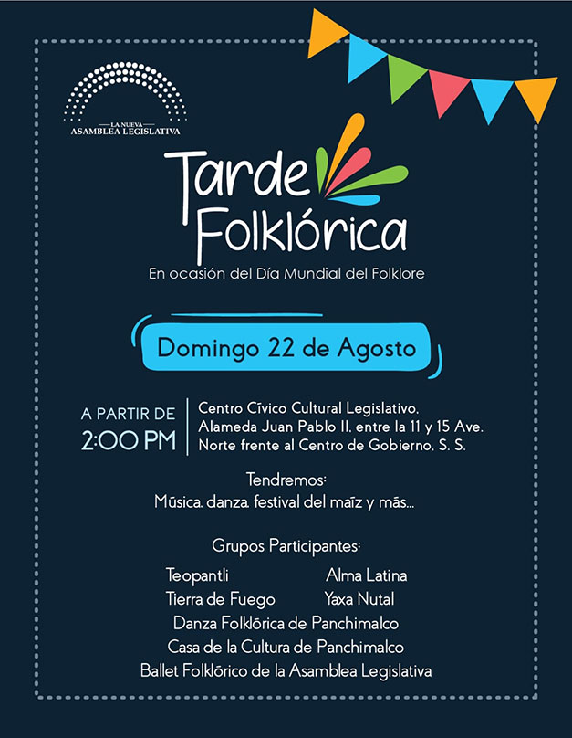 El próximo domingo 22 de agosto se celebra el Día Mundial del Folklore y en conmemoración a dicha fecha, siete agrupaciones de danza salvadoreñas se unirán para mostrar al público diferentes bailes autóctonos del país.