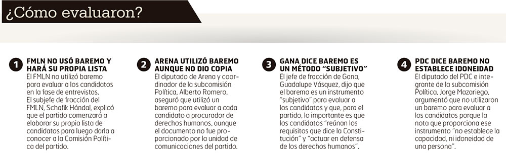 Al subjefe de fracción del FMLN e integrante de la Subcomisión, Jorge Schafik Hándal, se le preguntó: ¿cuál mecanismo utilizó usted en el proceso de entrevistas para identificar a los candidatos más idóneos al cargo? “Bueno, tú me quieres llevar al tema de los baremos, por ahí vas, yo sé que por ahí vas. Mirá, yo no ocupé ningún baremo, yo ya tengo mi método para eso”, respondió. ¿Cuáles fueron los criterios que utilizó?, se le insistió. “El que te expuse anteriormente, de acuerdo, no me le busqués tres pies al gato que tiene cuatro”, contestó.