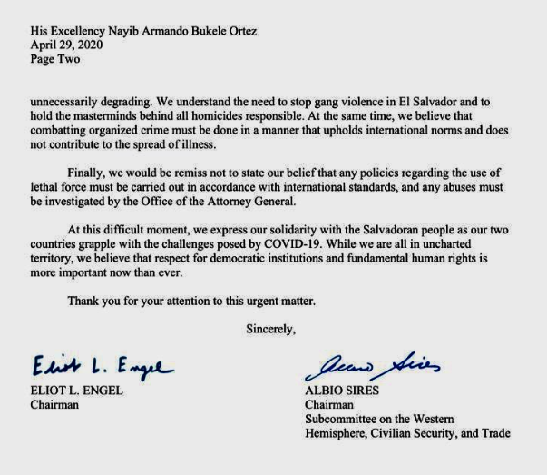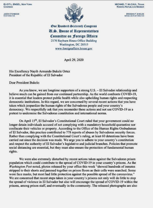 Eliot Engel, presidente del comité de relaciones exteriores, y Albio Sires, presidente del subcomité de asuntos del hemisferio occidental, de la Cámara de Representantes del Congreso de Estados Unidos, le dirigieron una carta al presidente Nayib Bukele en donde le expresan preocupación por “sus recientes acciones” que arriesgan los derechos humanos de los salvadoreños y la democracia del país. Le piden considerar estas acciones y no usar el COVID-19 como un pretexto para socavar la Constitución y las normas internacionales.