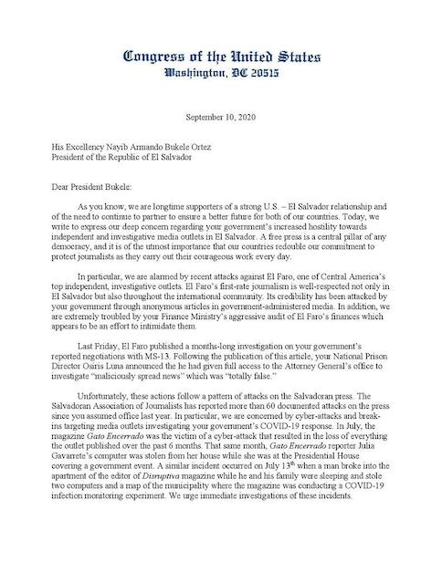 Hoy, escribimos para expresar nuestra profunda preocupación por la creciente hostilidad de su gobierno hacia los medios de comunicación independientes y de investigación en El Salvador"Los legisladores estadounidenses expresan su alarma por "los recientes ataques contra El Faro, uno de los principales medios de investigación independientes de Centroamérica" y advierten que "si bien es probable que los desacuerdos entre funcionarios del gobierno y los medios de comunicación ocurran en cualquier democracia, creemos que los gobiernos siempre deben garantizar el pleno respeto de la libertad de prensa”.