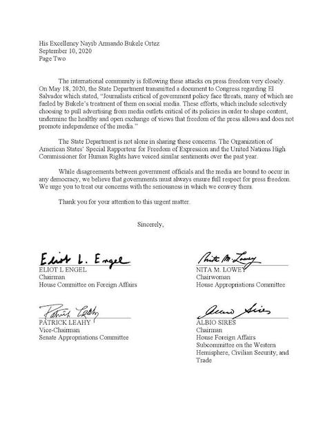 "Como saben, desde hace mucho tiempo apoyamos una relación sólida entre Estados Unidos y El Salvador y la necesidad de seguir colaborando para garantizar un futuro mejor para nuestros dos países. Hoy, escribimos para expresar nuestra profunda preocupación por la creciente hostilidad de su gobierno hacia los medios de comunicación independientes y de investigación en El Salvador. Una prensa libre es un pilar central de cualquier democracia y es de suma importancia que nuestros países redoblen nuestro compromiso de proteger a los periodistas en el desempeño de su valiente trabajo todos los días", dice la carta que fue hecha pública hoy por la oficina del congresista Engel.
