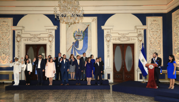 Luego de la toma de protesta, el presidente de la República, Nayib Bukele, junto a la primera dama, Gabriela Rodríguez de Bukele, juramentó al gabinete de gobierno 2019-2024, en el salón azul del Palacio Nacional, en el Centro Histórico capitalino.