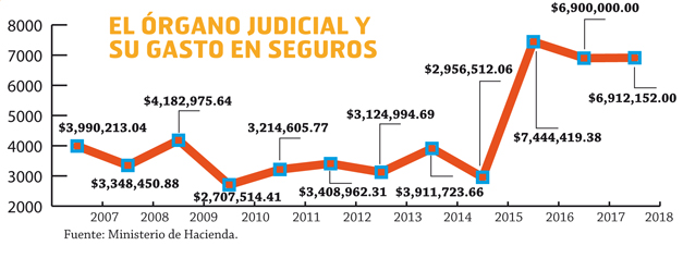 El gasto en seguros del personal, jueces y magistrados del Órgano Judicial ha ido creciendo año con año. En los últimos 10 años, la Corte ha gastado $50 millones en seguros hospitalarios y el próximo año este gasto no será la excepción. Respecto a 2007, el gasto en seguros de salud y de vida en el Órgano Judicial se ha duplicado.