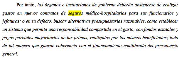 La Sala de lo Constitucional, en su sentencia contra el presupuesto estatal de 2017, advirtió que “los órganos fundamentales de gobierno –Ejecutivo, Legislativo y Judicial– como otros órganos e instituciones destinan cada año cuantiosas cantidades de dinero para pagar seguros médico-hospitalarios para sus funcionarios y jefaturas”, lo que consideró “incide en el desfinanciamiento del presupuesto general”.