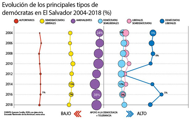 Los salvadoreños considerados ambivalentes suman el 37.3 %, más que en Nicaragua que tiene un 25.7 %. En El Salvador, según el informe, este grupo de personas ha experimentado un crecimiento de 14 puntos porcentuales a lo largo de 12 años.