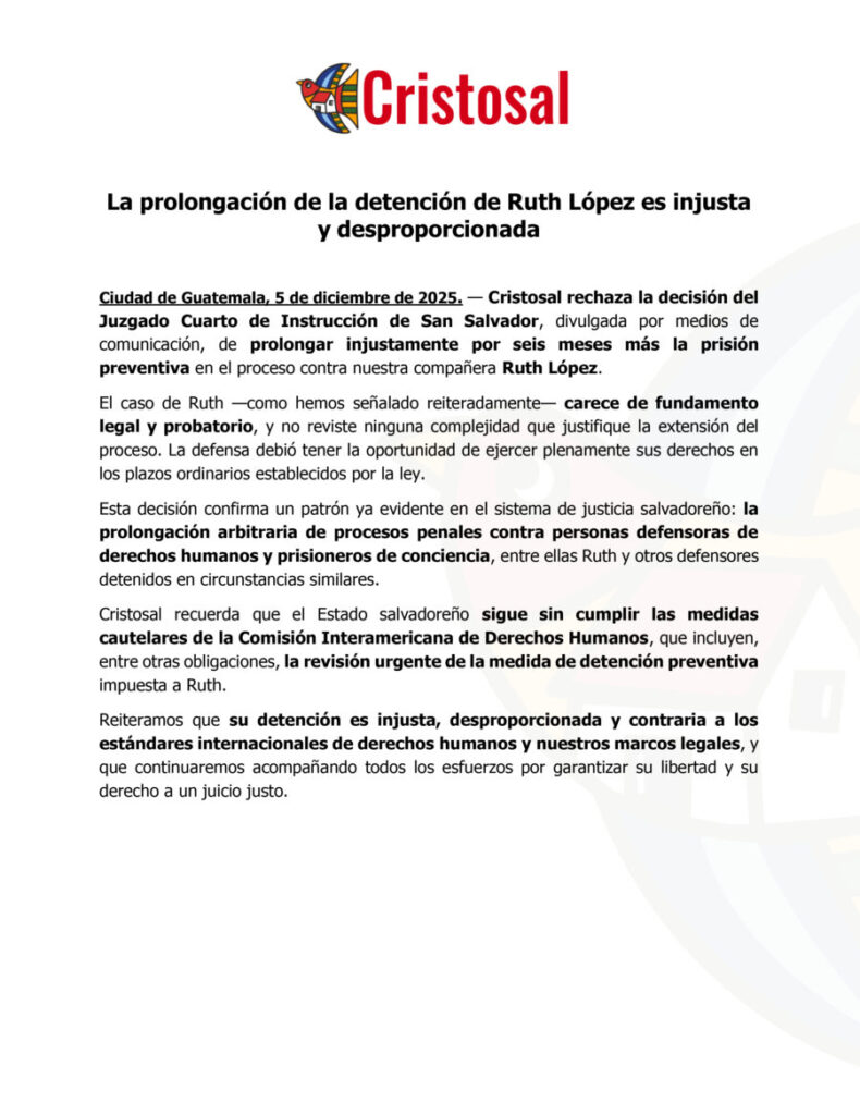 “Esta decisión confirma un patrón ya evidente en el sistema de justicia salvadoreño: la prolongación arbitraria de procesos penales contra personas defensoras de derechos humanos y prisioneros de conciencia, entre ellas Ruth y otros defensores detenidos en circunstancias similares”. indicó Cristosal en su comunicado.