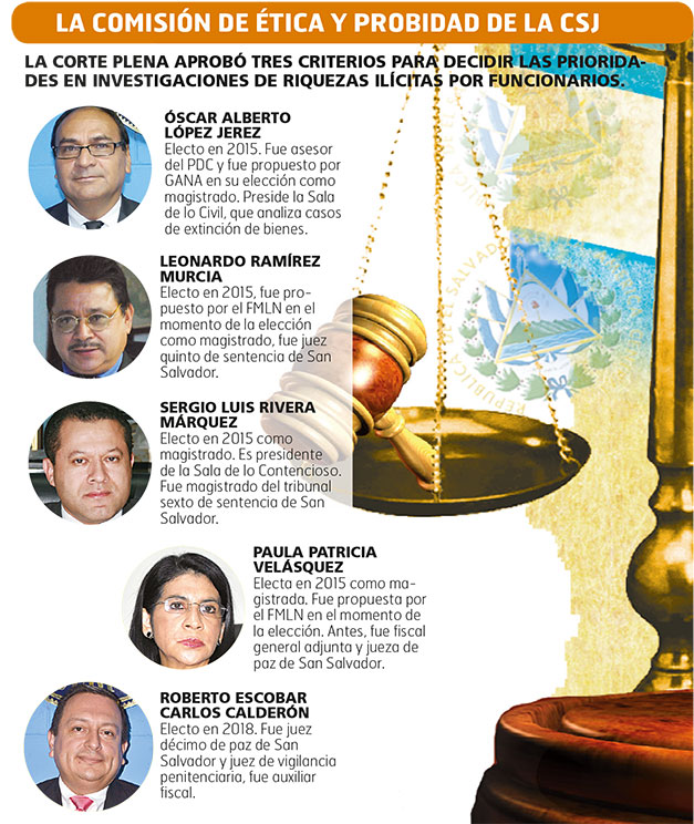 La Comisión de Etica y Probidad  coordina el trabajo de investigación a los funcionarios públicos para indagar indicios de enriquecimiento ilícito. La CSJ definió en mayo de 2016 como criterios de investigación la antigüedad, la relevancia y la gravedad o notoriedad de los casos.
