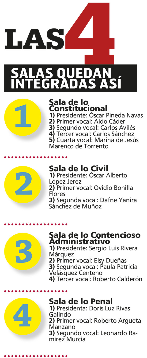 La Sala de lo Contencioso Administrativo estará constituida por Sergio Luis Rivera, presidente; Elsy Dueñas, Paula Velásquez y Roberto Calderón, como primer, segundo y tercer vocal respectivamente.