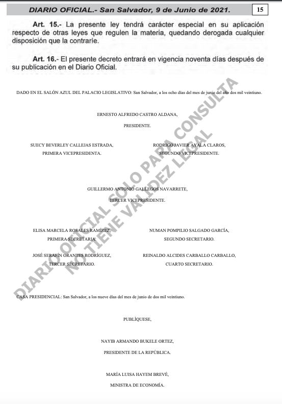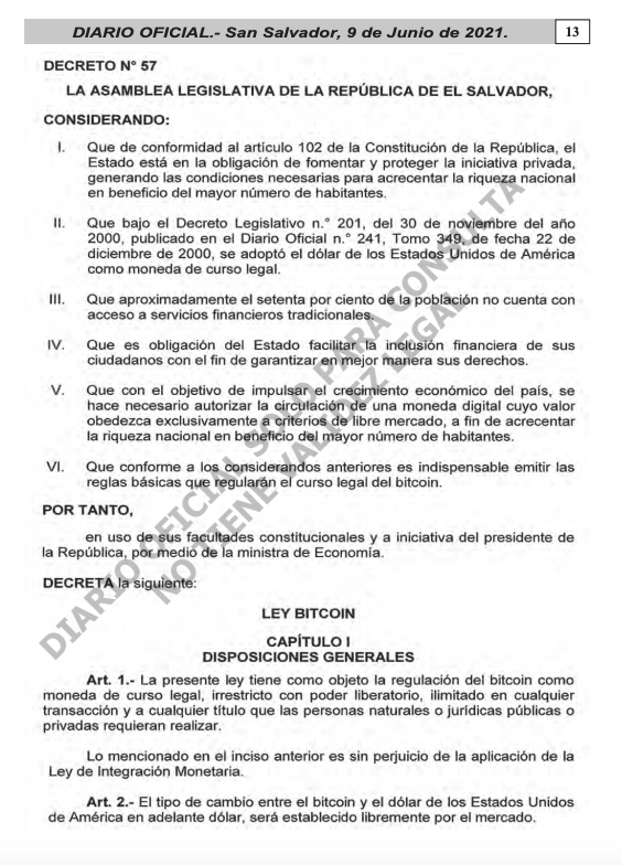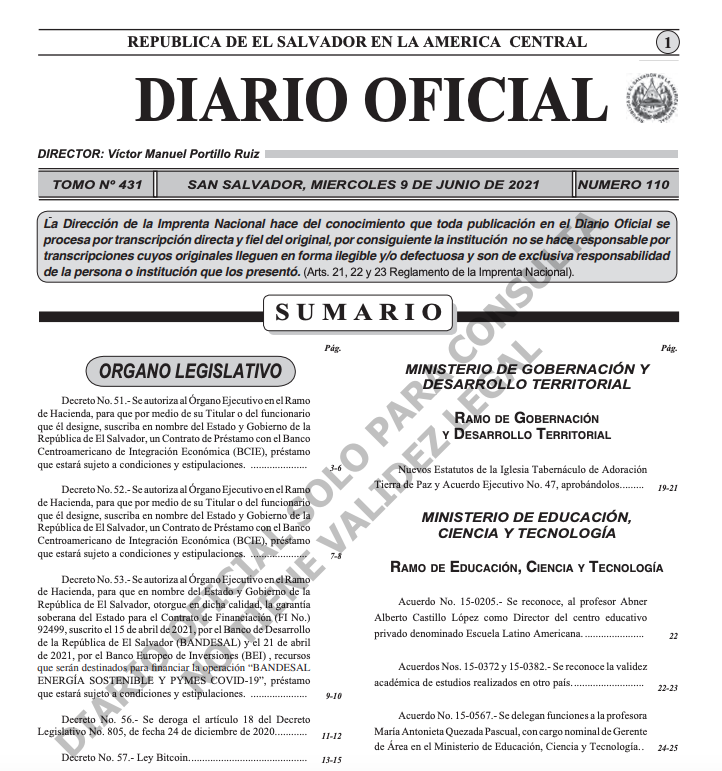 El decreto 57 de la "Ley Bitcoin" fue publicado en las páginas 13, 14 y 15 del Diario Oficial tomo 431 número 110 con fecha miércoles 9 de junio, el cual fue divulgado hoy en el sitio web de la Imprenta Nacional.