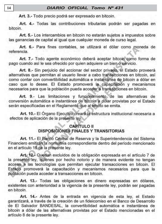 La normativa declara el bitcoin como moneda de curso legal y tiene carácter especial, es decir, prevalece ante otras leyes que puedan contradecirla. Además, obliga a aceptar bitcoins como forma de pago y promete convertibilidad automática por parte del Estado, a través del Banco de Desarrollo de El Salvador (Bandesal).