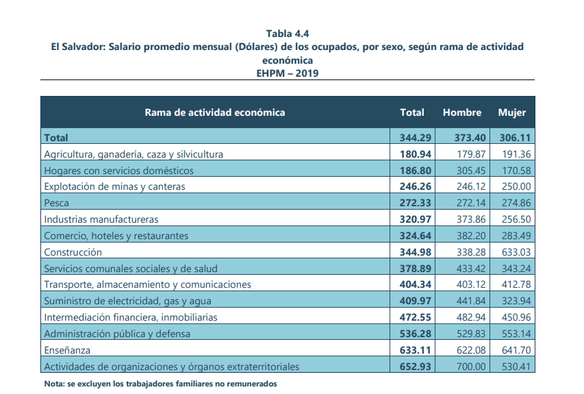 Esta encuesta, realizada cada año por la Dirección General de Estadísticas y Censos (Digestyc), revela que en 2019 los hombres percibieron un salario promedio mensual de $373.40. Esta suma es $67.29 a favor de la población masculina frente a los $306.11 que gana una mujer salvadoreña.