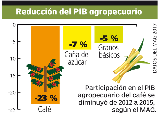 El técnico explicó que el 40 % del parque cafetalero actual se ubica en la parte baja y es la zona donde más estragos ocasionaría las variaciones del clima. A inicios de 2017, el Ministerio de Agricultura y Ganadería (MAG) indicó que en los últimos cinco años la participación del sector café en el Producto Interno Bruto agropecuario sufrió una caída del 23 % como consecuencia del cambio climático y el fenómeno El Niño.