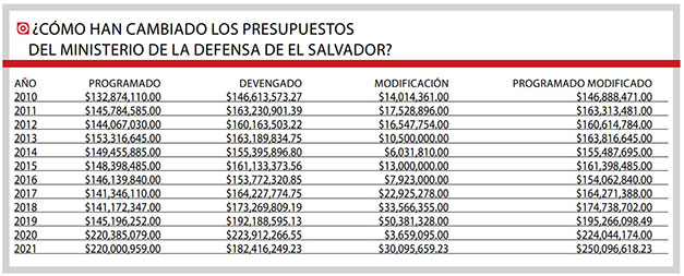 Para el 2022, el presupuesto de Defensa Nacional se prevé en $256,696,806, lo que implicaría un aumento de $36.7 millones o 16 % respecto al presupuesto aprobado en 2021.Sin embargo, si se compara con el presupuesto que Defensa ha modificado para este año, el presupuesto apenas subiría $6.6 millones, ya que ha modificado el gasto en $250 millones.