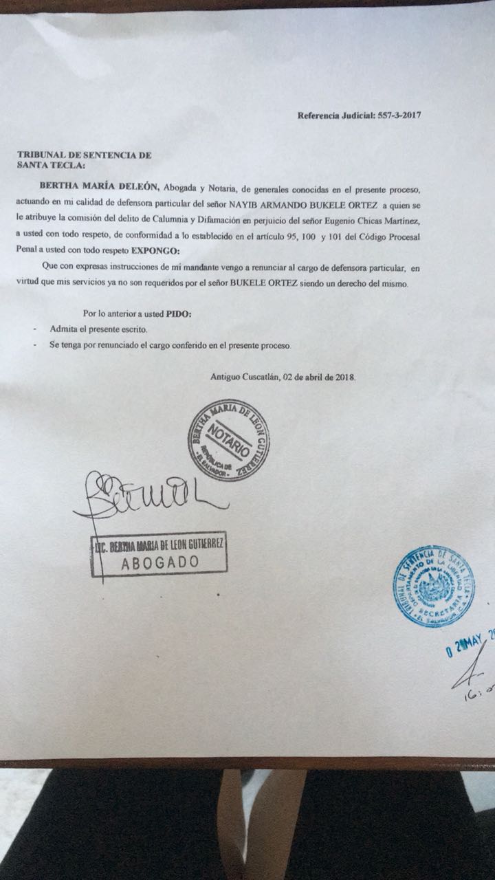 RT @juancarlosvrm Tribunal de Sentencia de Santa Tecla suspende audiencia de aportación de pruebas contra exalcalde de San Salvador, @nayibbukele, por nombramiento de nuevos abogados, tras renuncia de su defensora Bertha Deleón pic.twitter.com/mL0zpNxK2j