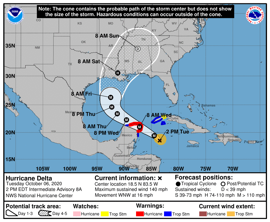 Se pronostica que será un huracán extremadamente peligroso de categoría 4 cuando alcance la península de Yucatán el miércoles". Centro Nacional de HuracanesDelta, de categoría 4 en una escala de 5, se encontraba este martes unos 420 km al sureste de Cozumel, México, hacia donde se desplaza a una velocidad de 26 km/h.