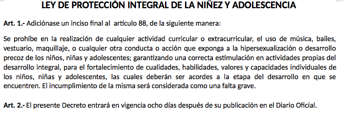 "Se prohíbe en la realización de cualquier actividad curricular o extracurricular el uso de música, bailes, vestuario, maquillaje o cualquier otra conducta o acción que exponga a la hipersexualización o desarrollo precoz de los niños, niñas y adolescentes", reza la propuesta de reforma al artículo 88 de la Lepina.