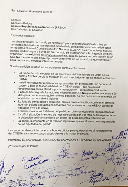 Diputados pidieron en una carta enviada hoy a la Comisión Política de la Alianza Republicana Nacionalista (Arena) la renuncia inmediata de la dirigencia, el Consejo Ejecutivo Nacional de Arena (Coena).