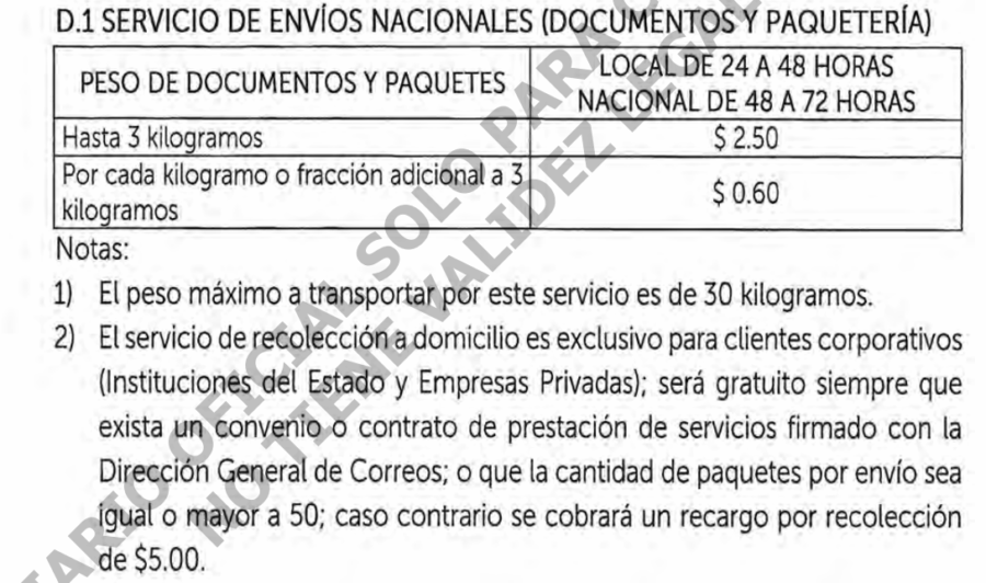 Los servicios nacionales de envío de documentos y paquetes, que pueden tardar entre 24 y 48 horas, y entre 48 a 72 horas, con un peso de hasta tres kilogramos, cuesta $2.50 y por cada kilogramo o fracción adicional, se pagarán $0.60.