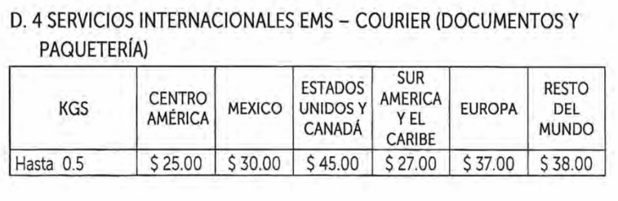 Las tarifas de envío de documentos o paquetes para Estados Unidos es de $45 por un peso de 500 gramos; para Centroamérica es $25.00; de esa tarifa por cada 500 gramos aumenta en tarifa $2.75. La tarifa para México es $30, y por cada 500 gramos extra, aumenta $3.