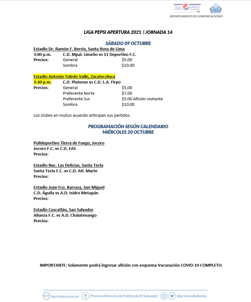 “Este fin de semana la selección estará en Costa Rica y al final cuatro equipos accedieron a jugar, darle las gracias a Once Deportivo por el hecho de poder jugar, el partido está programado para el sábado para las 3 de la tarde ante Municipal Limeño, también Platense recibe a Firpo el sábado a las 2 de la tarde”, añadió.