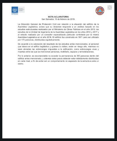 "La Dirección General de Protección Civil con relación a la situación del edificio de la Asamblea Legislativa, aclara que su dictamen responde a un análisis basado en los estudios estructurales realizados por el Ministerio de Obras Públicas en el año 2013; los estudios de la Unidad de Ingeniería de la Asamblea Legislativa en los años 2014 y 2017 y al estudio realizado por un consultor especializado particular contratado por la misma Asamblea Legislativa en el año 2016", indican.