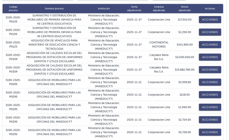 En junio de 2025, se adjudicó mediante comparación de precios una compra de $16,975.50 de zapatos escolares para estudiantes de diferentes modalidades. El monto planificado era $80,324.80. El beneficiario final fue Elizabeth Hernández Guardado.