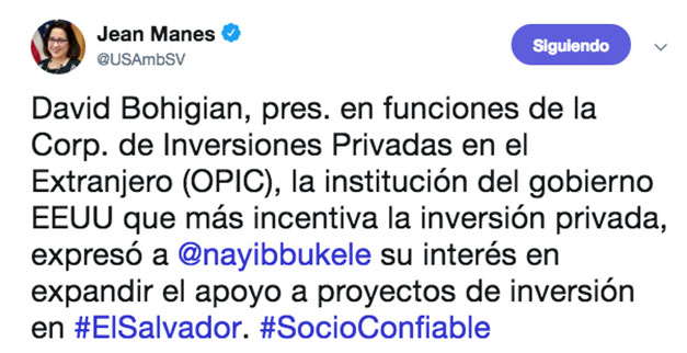 El presidente en funciones de la Corporación de Inversiones Privadas en el Extranjero (OPIC), David Bohigian, expresó al presidente electo Nayib Bukele, su interés en expandir el apoyo a proyectos de inversión en El Salvador. Así lo reveló ayer la embajadora de los Estados Unidos, Jean Manes.